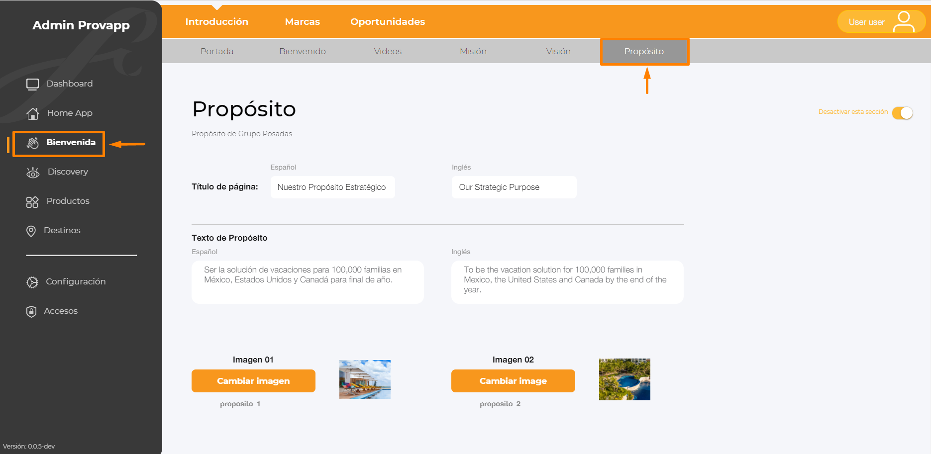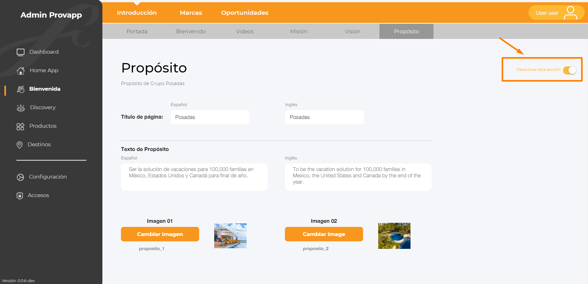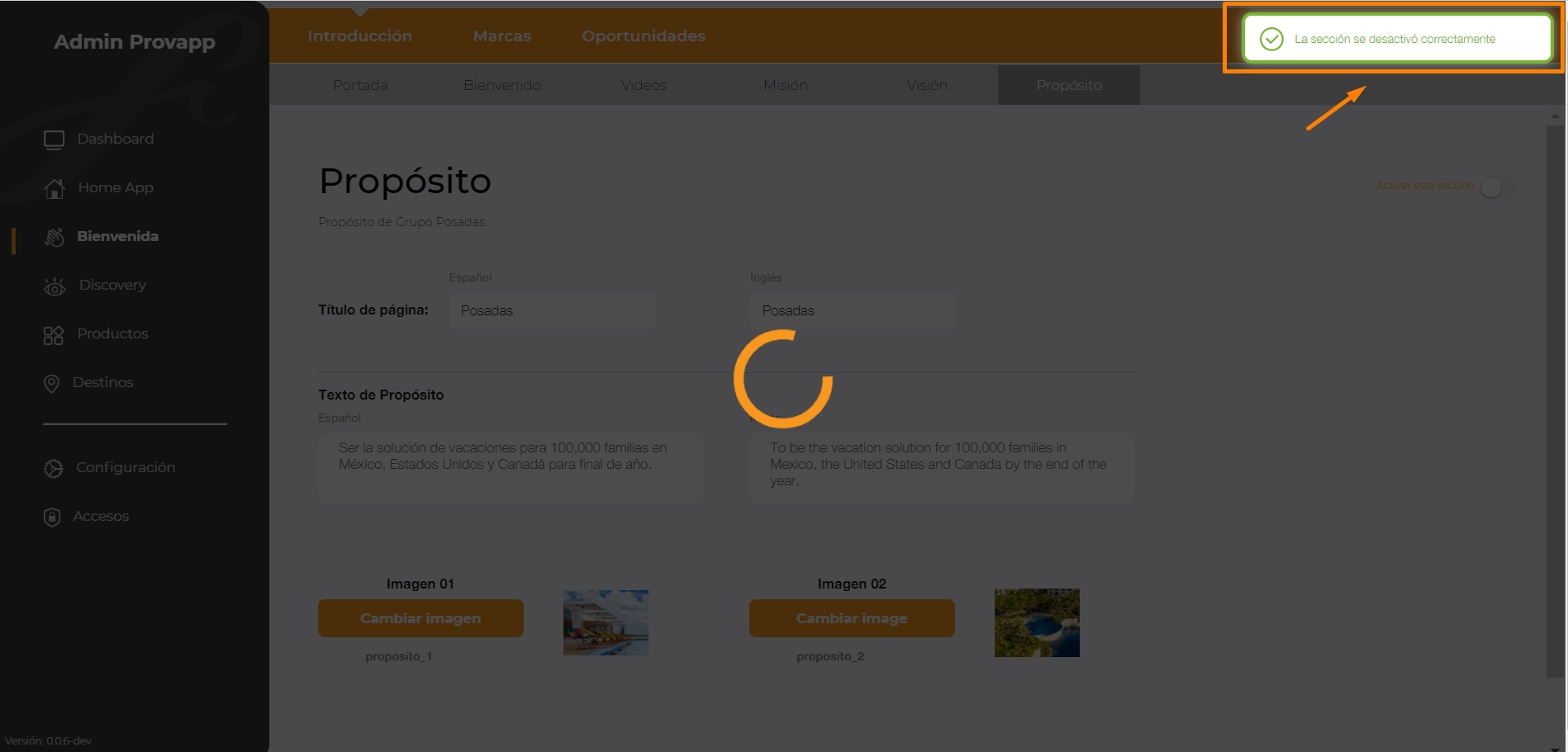 10.- Para Desactivar la sección dar clic en el switch, Desactivar esta sección.