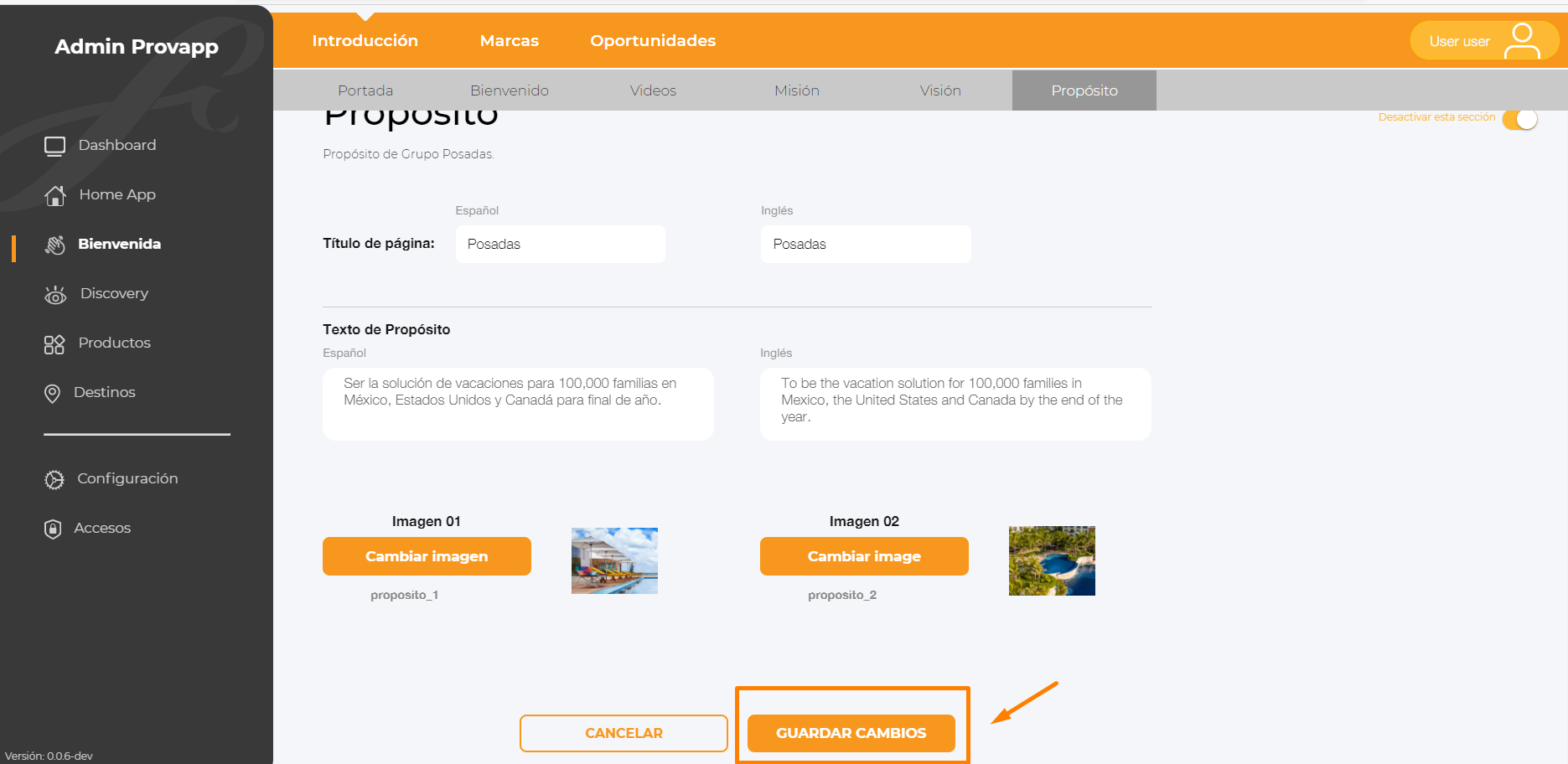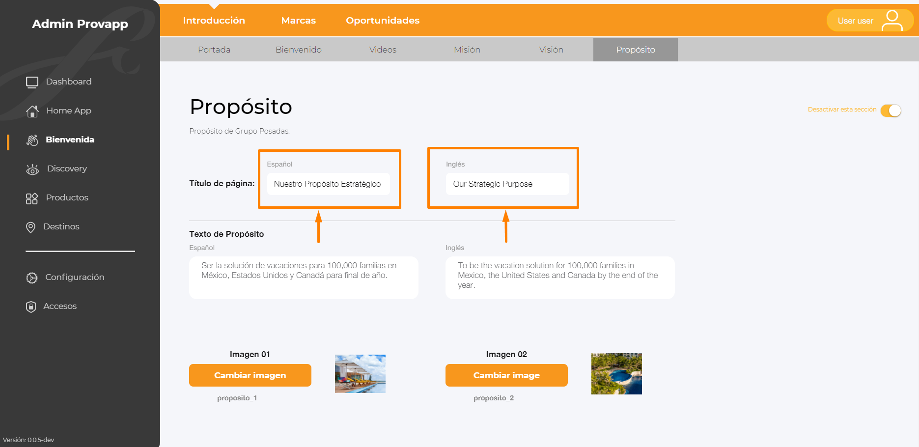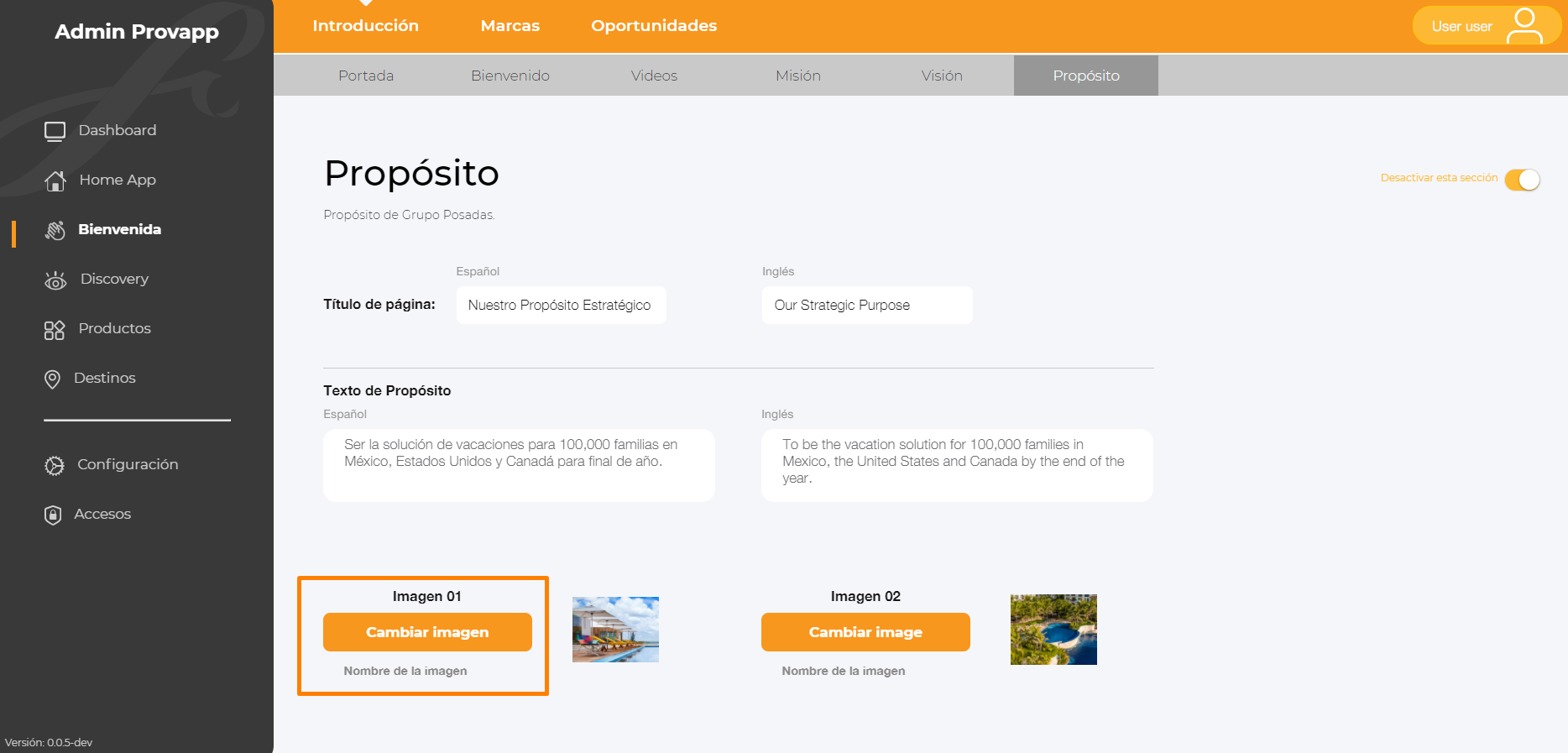 10.- Para Desactivar la sección dar clic en el switch, Desactivar esta sección.