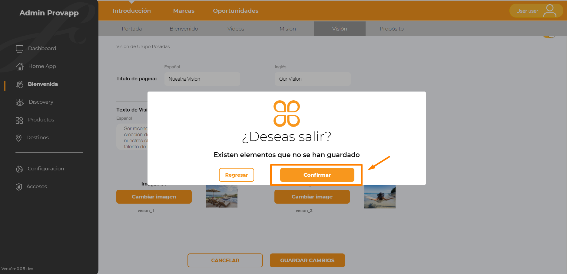 8.- Si desea cambiar de sección teniendo datos agregados en los campos, se mostrará una ventana de confirmación, de la acción que desea realizar.