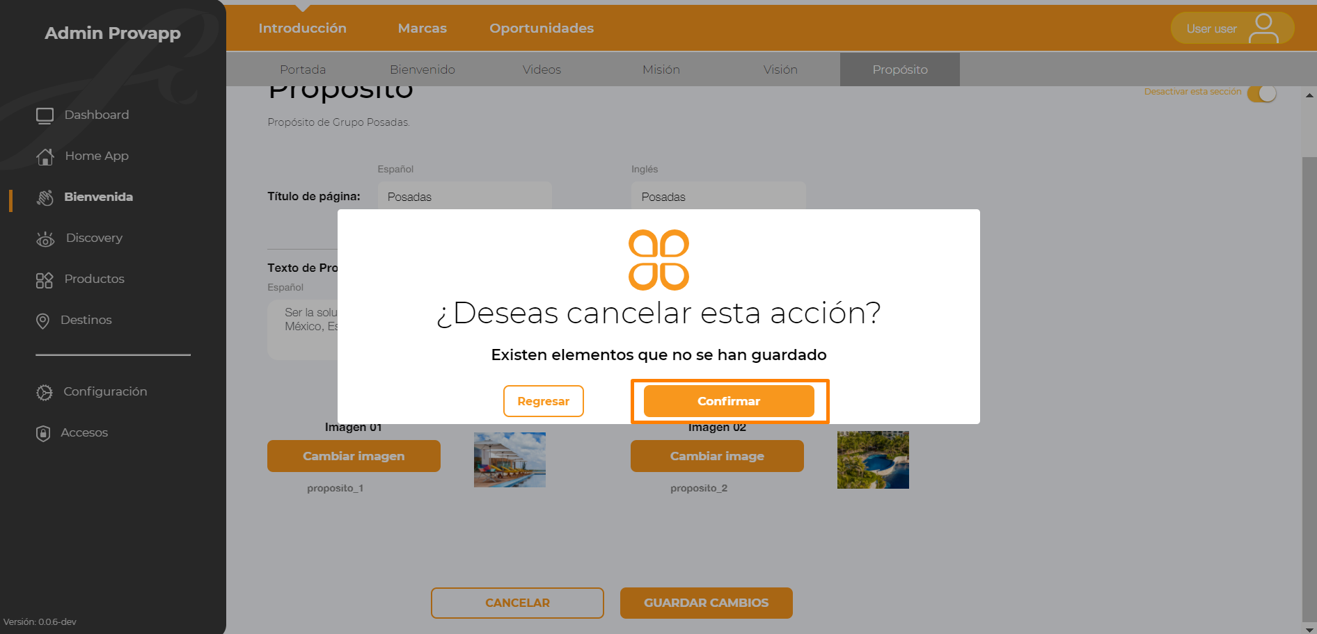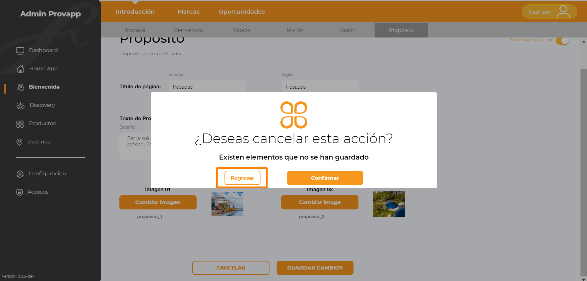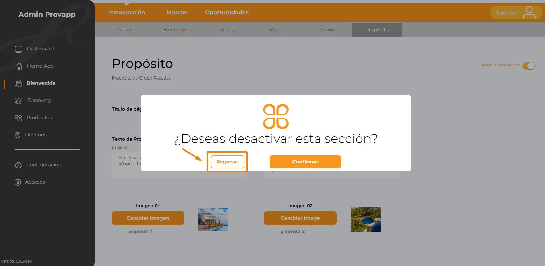 O bien, si da clic en Regresar, para no realizar ninguna modificación a la sección.