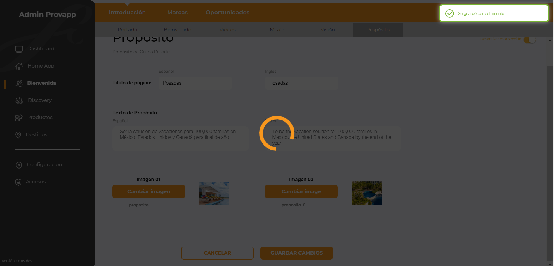 12.- Visualizará el mensaje : La sección se desactivo correctamente.