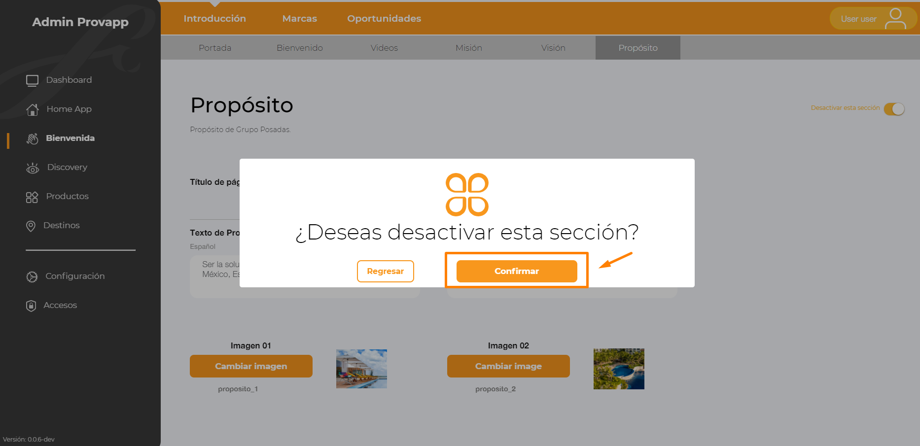 11.- Para guardar los cambios efectuados, dar clic en Confirmar. De esta manera se podrá Desactivar la sección.
