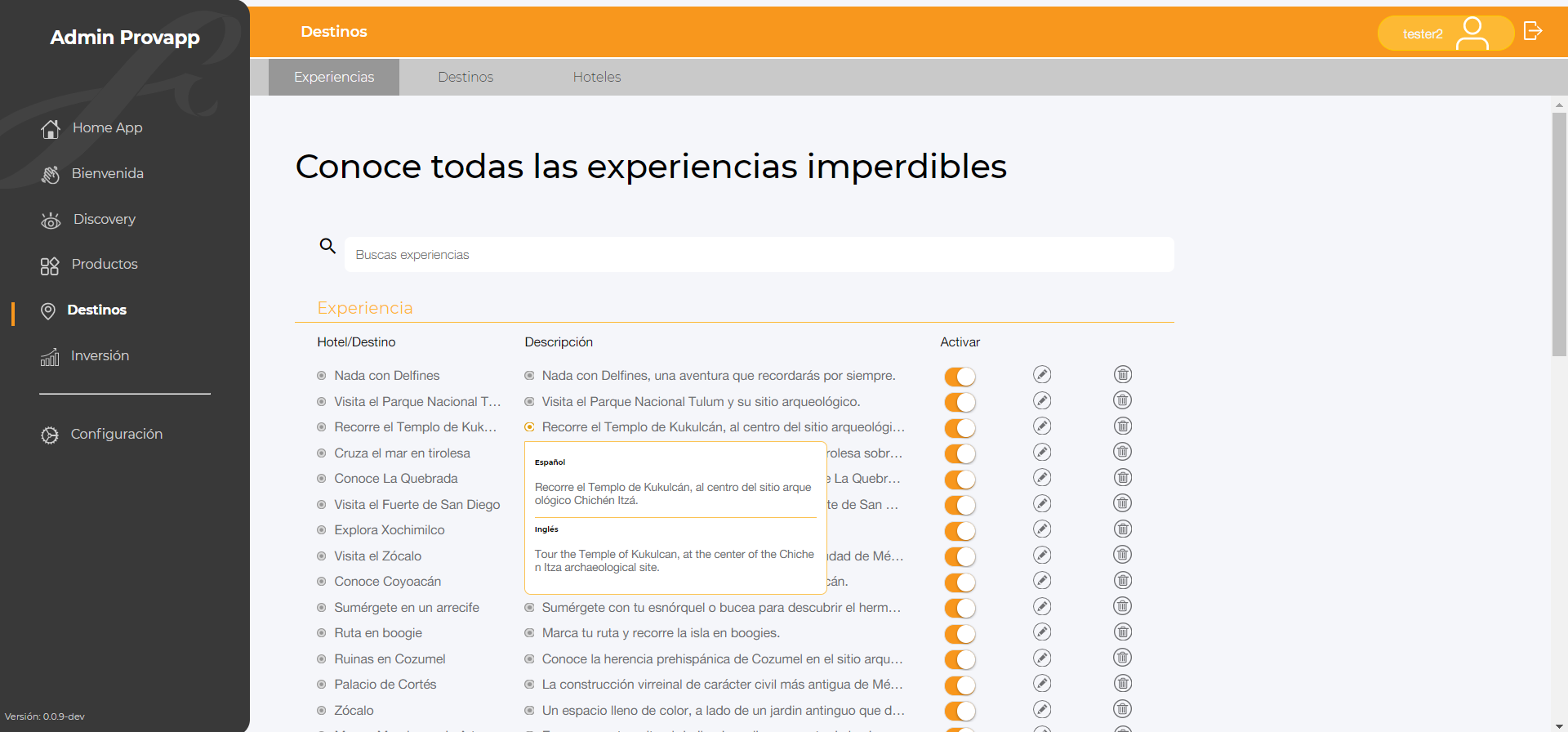 Nota importante: Si la experiencia se encuentra asociada un destino, no se podrá eliminar ni desactivar solo editar.