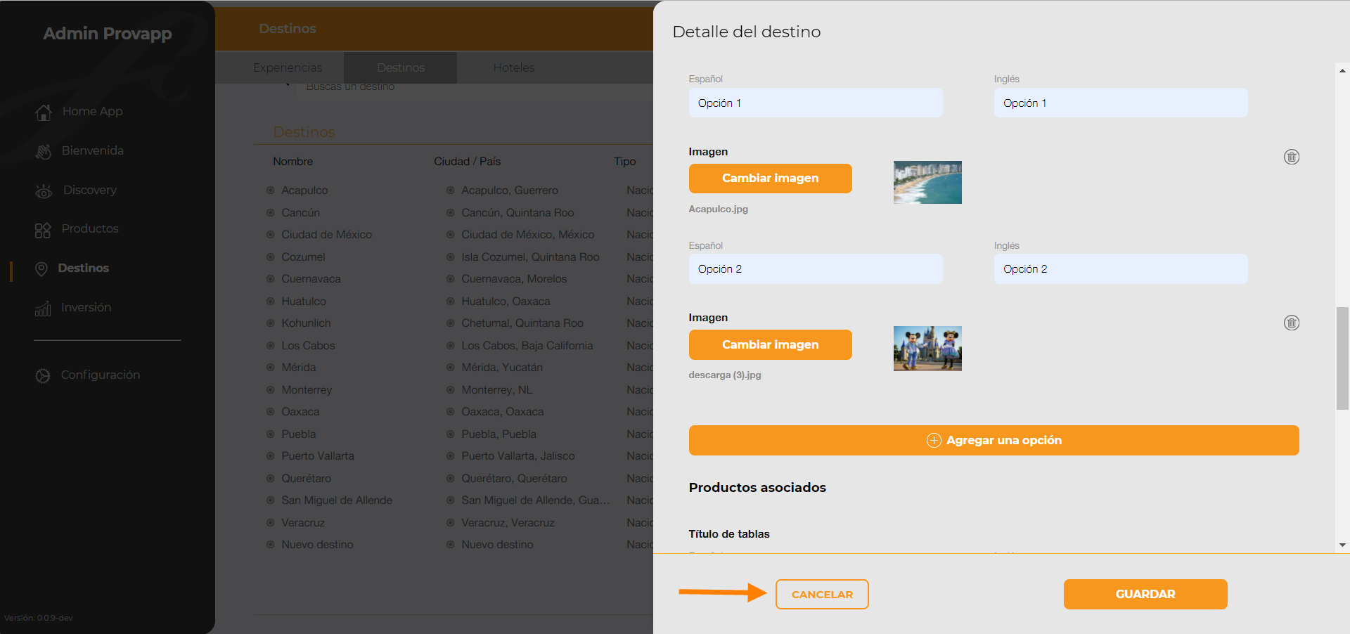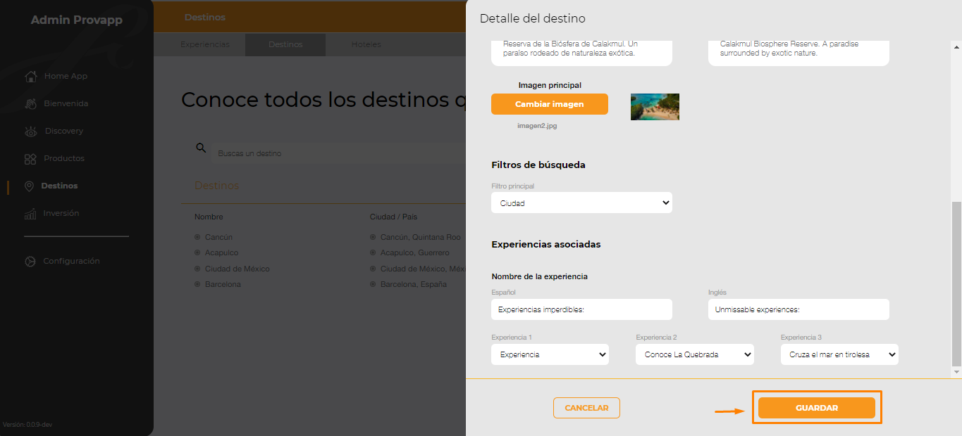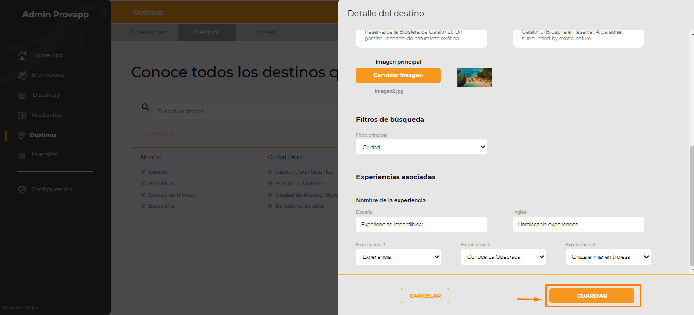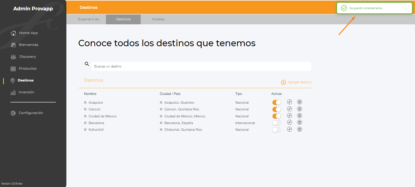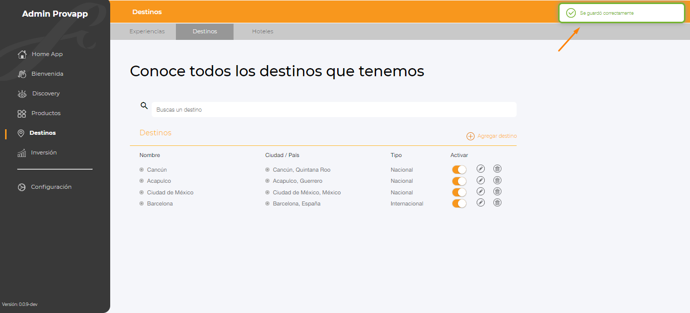 Nota: Deberá estar activo, y de esta forma al crear un hotel se pueda asociar al destino, de lo contrario no se visualizará en la sección Hoteles.