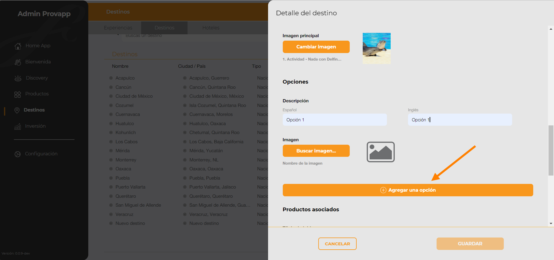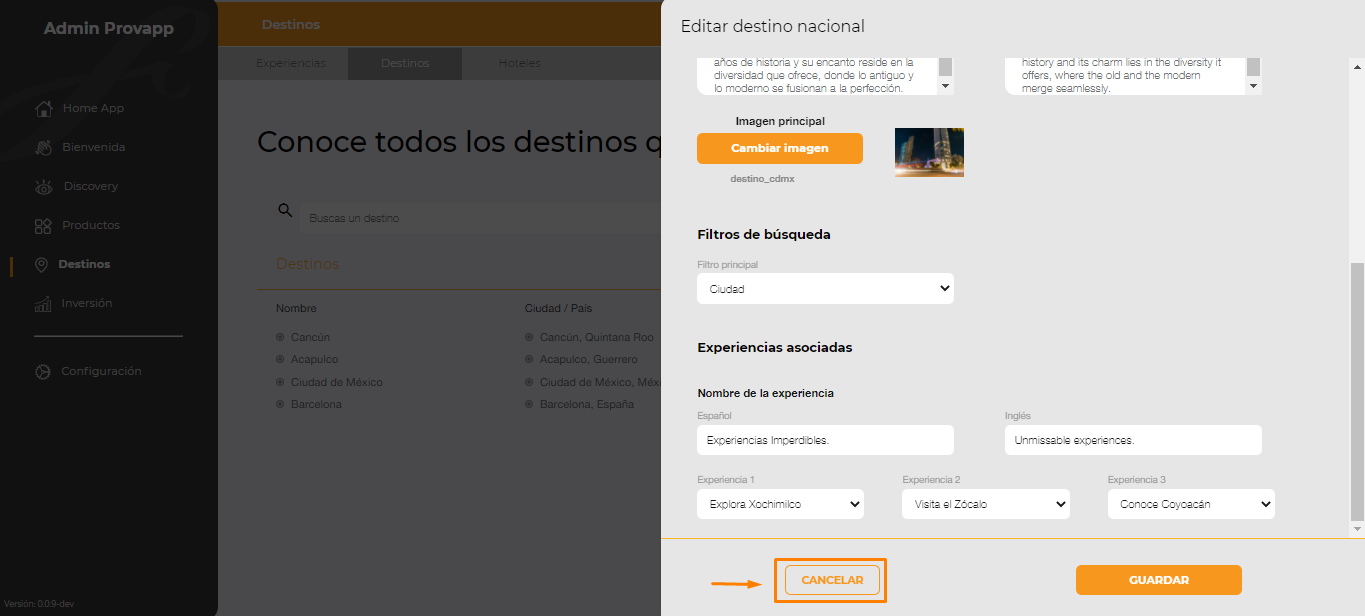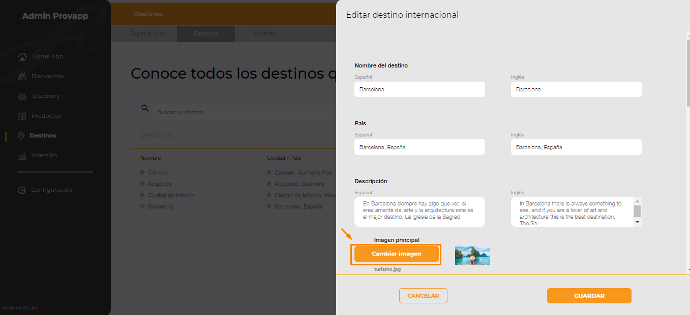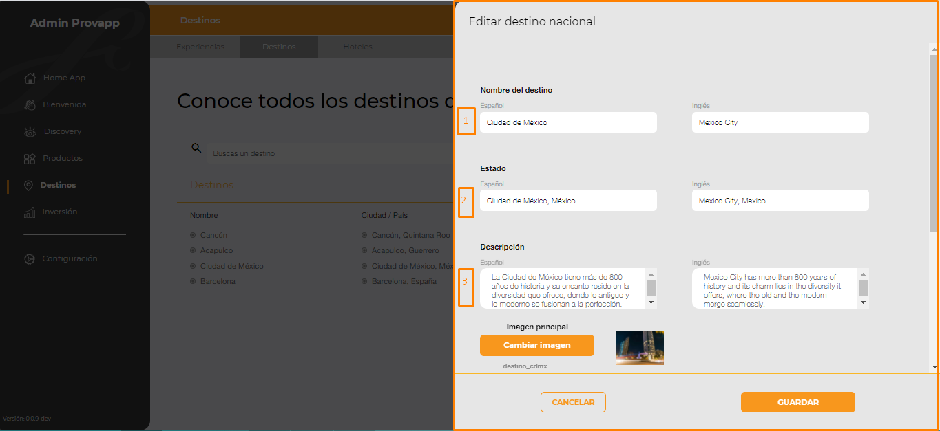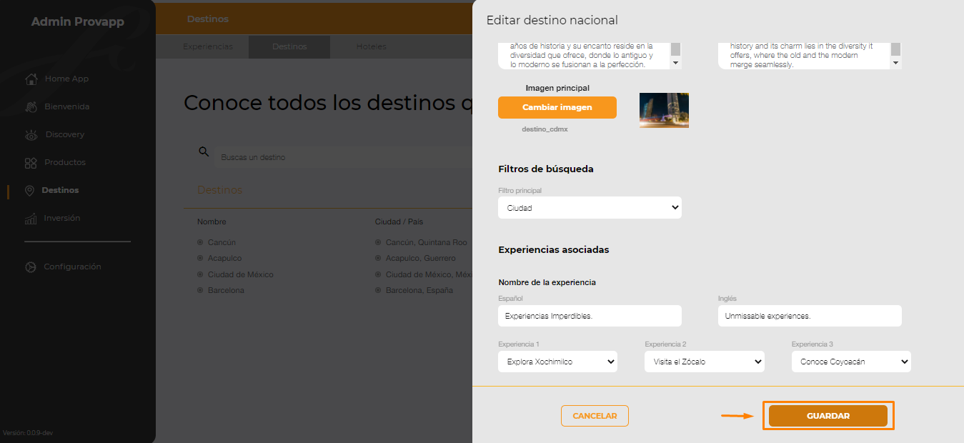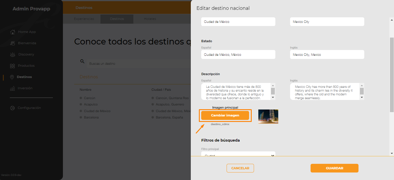 Nota: Deberá estar activo, y de esta forma al crear un hotel se pueda asociar al destino, de lo contrario no se visualizará en la sección Hoteles.