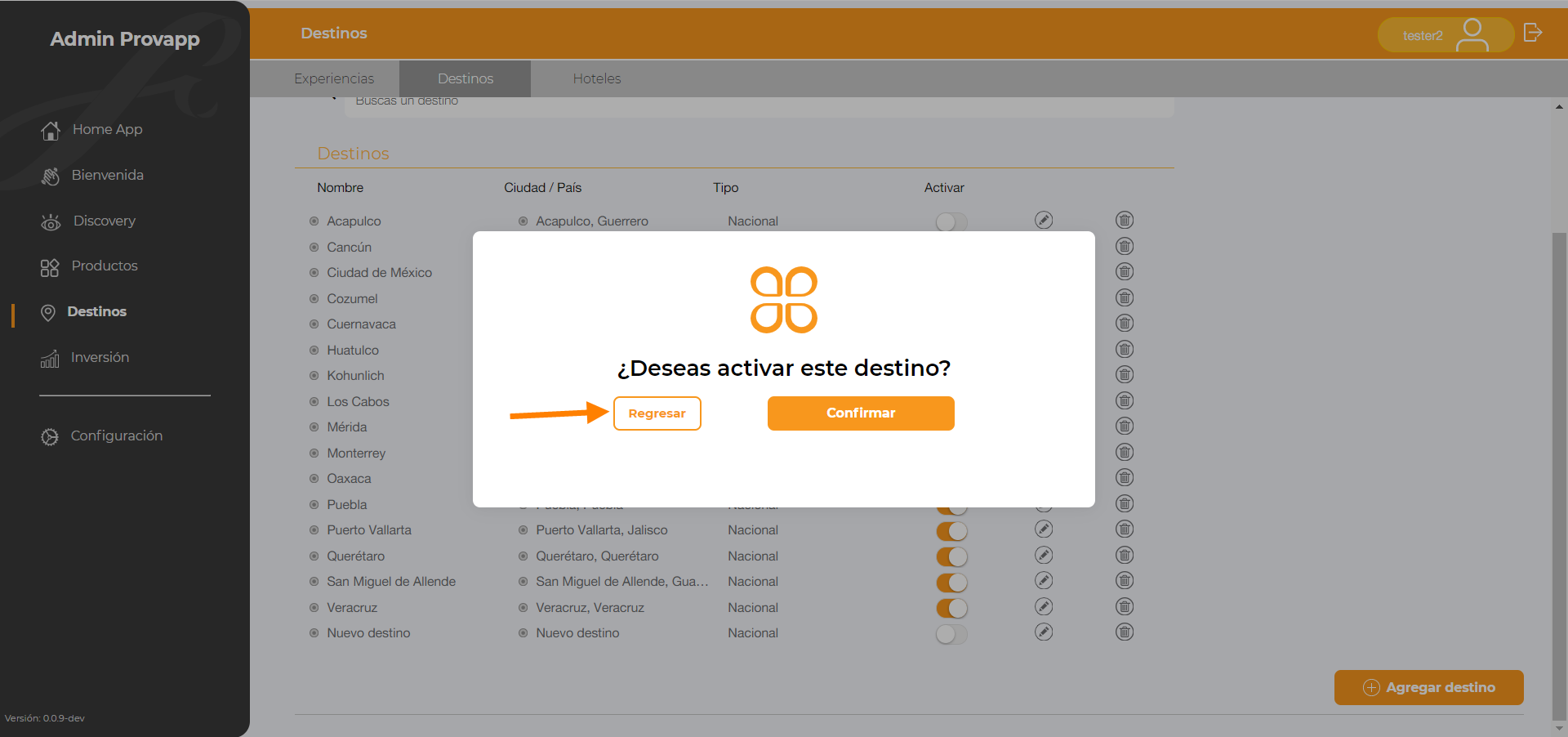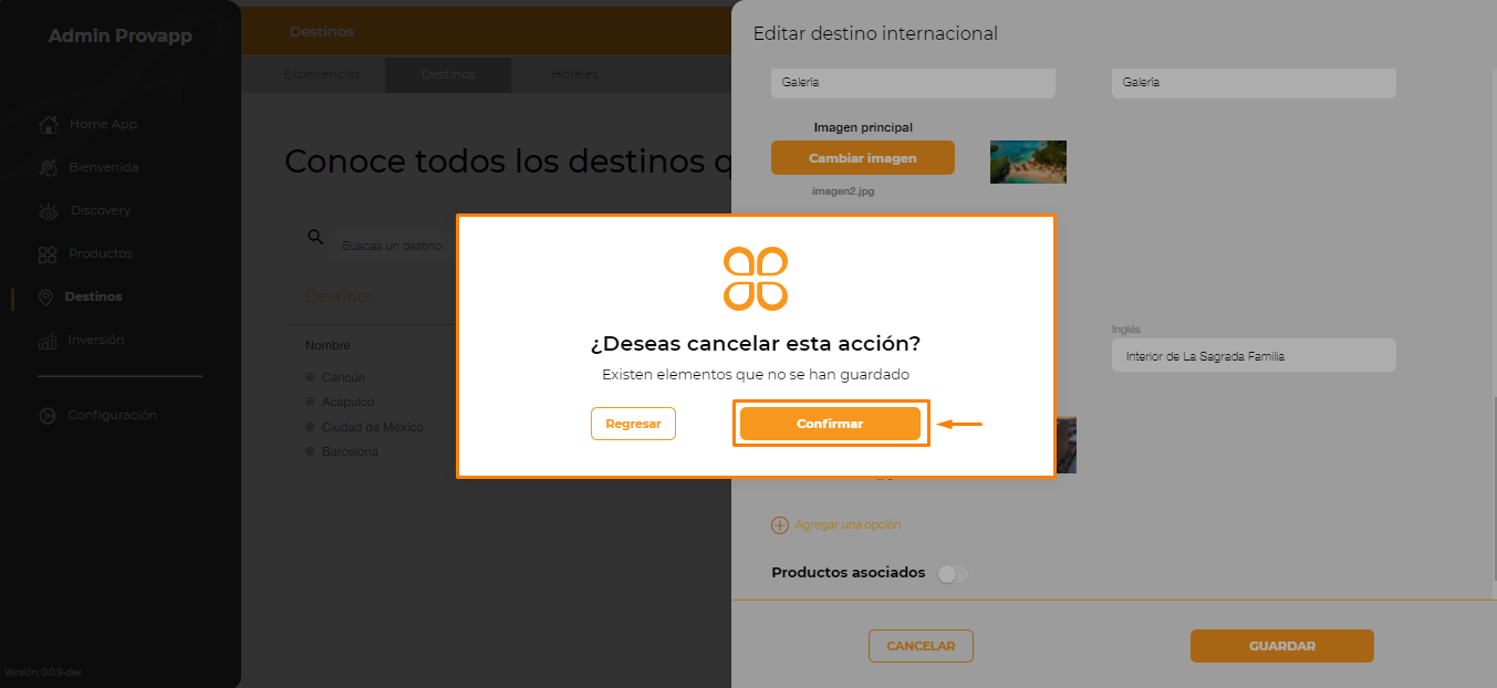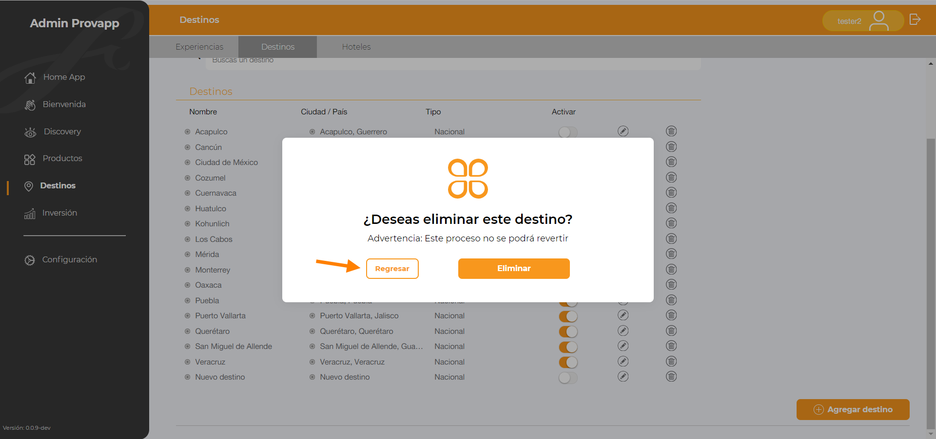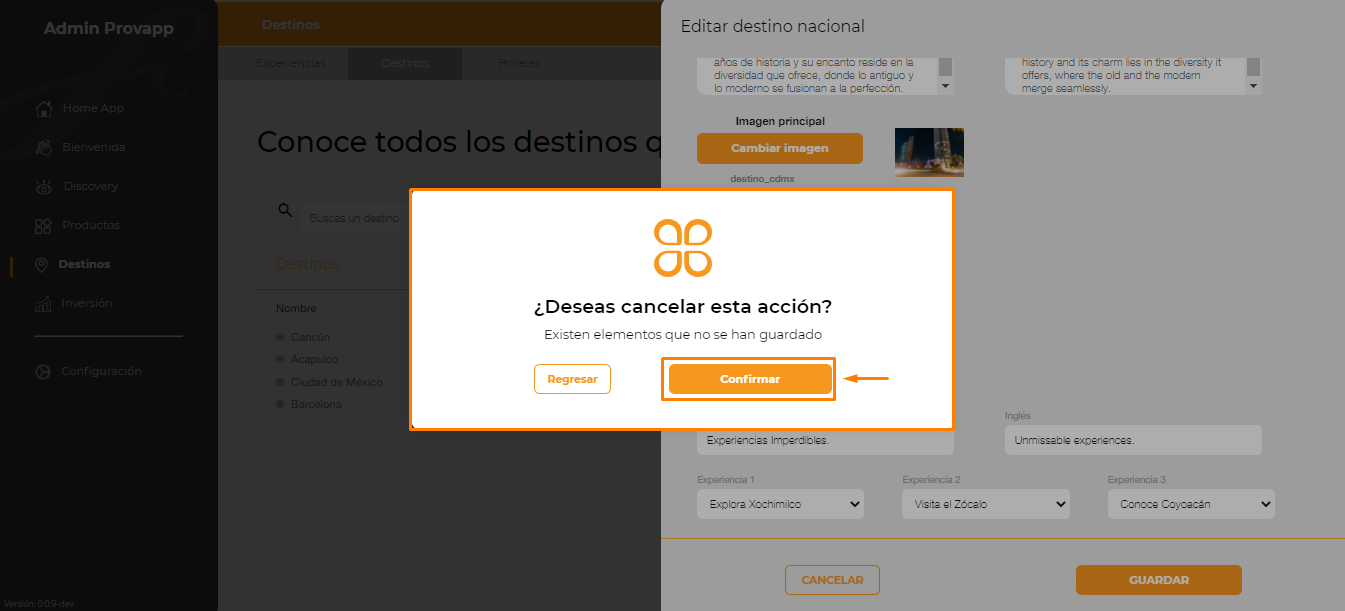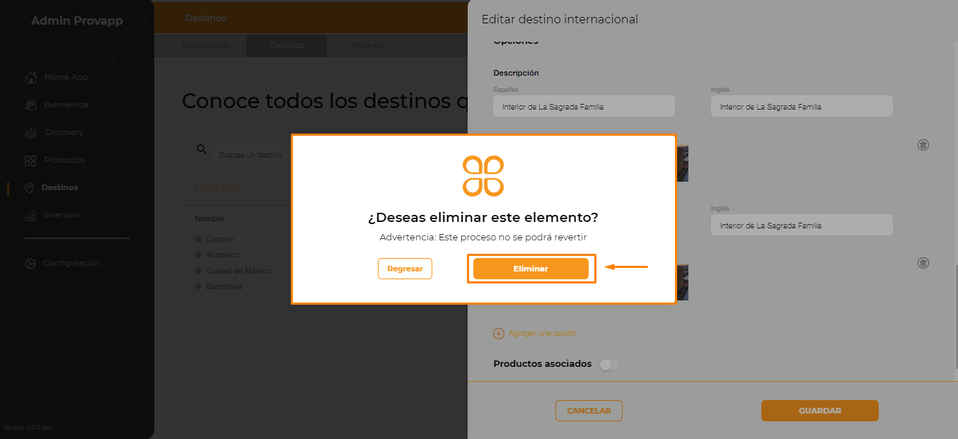 Nota importante: Si existen hoteles asociados al destino, se podrá Eliminar sin embargo se mostrará un modal indicando los hoteles que están relacionados mismos que también serán eliminados al confirmar la acción.