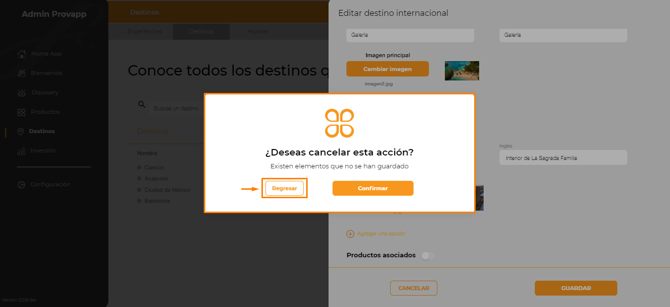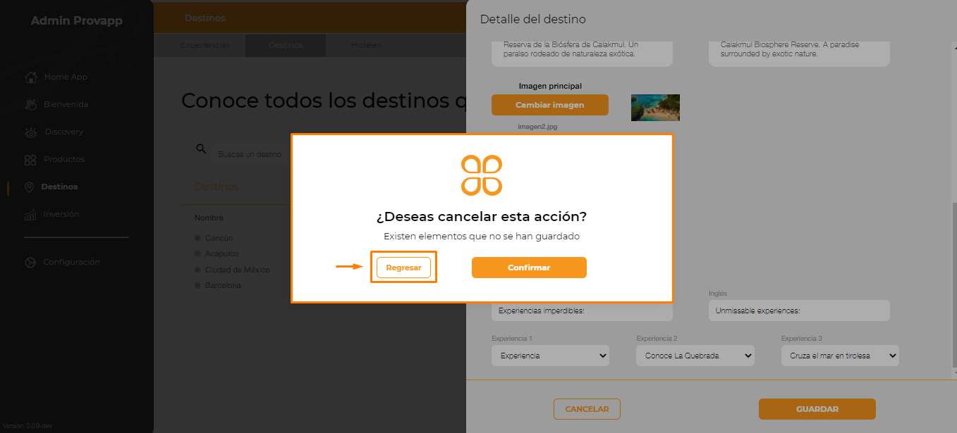 O bien, si da clic en regresar, para no realizar ninguna modificación al destino.