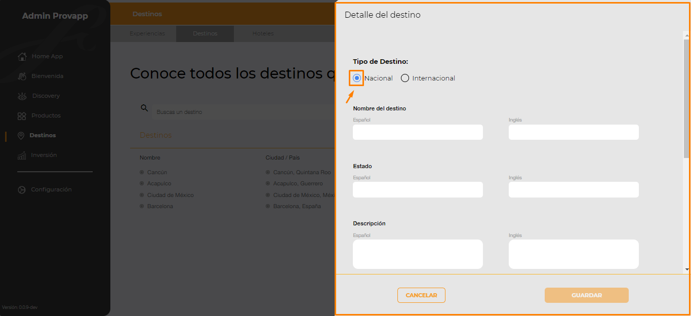 23.- Se abrirá una barra lateral derecha donde podremos seleccionar si desea agregar un Destino Nacional o Internacional.