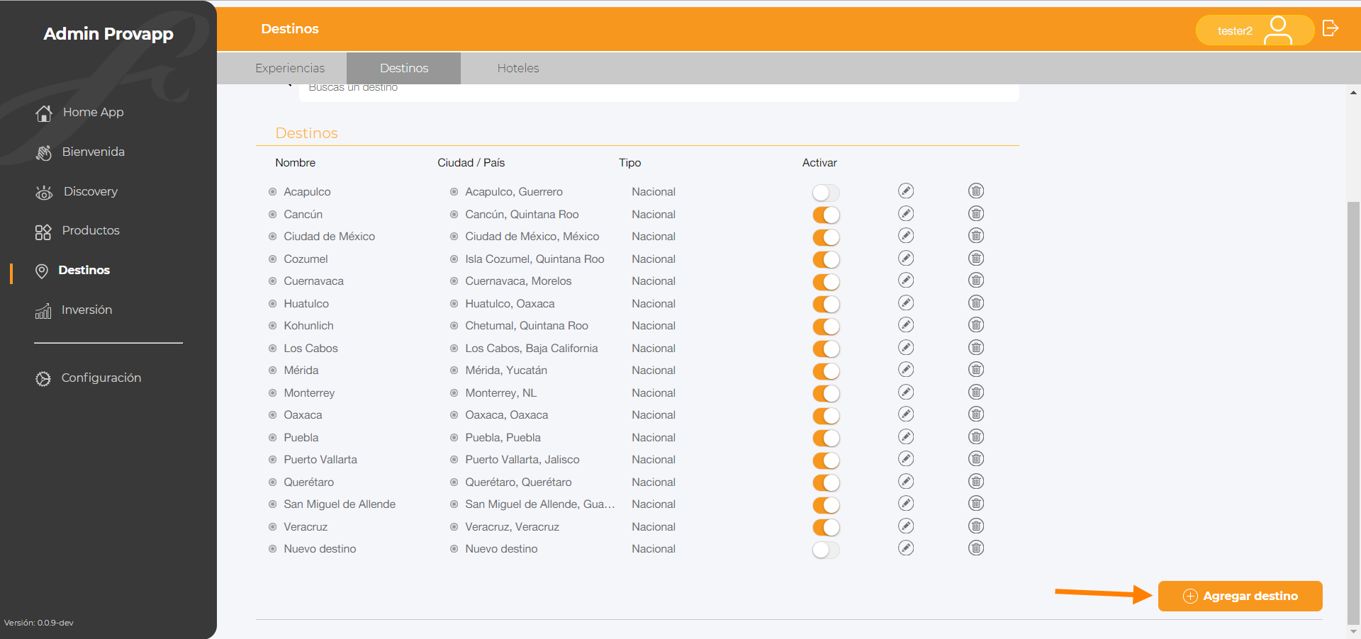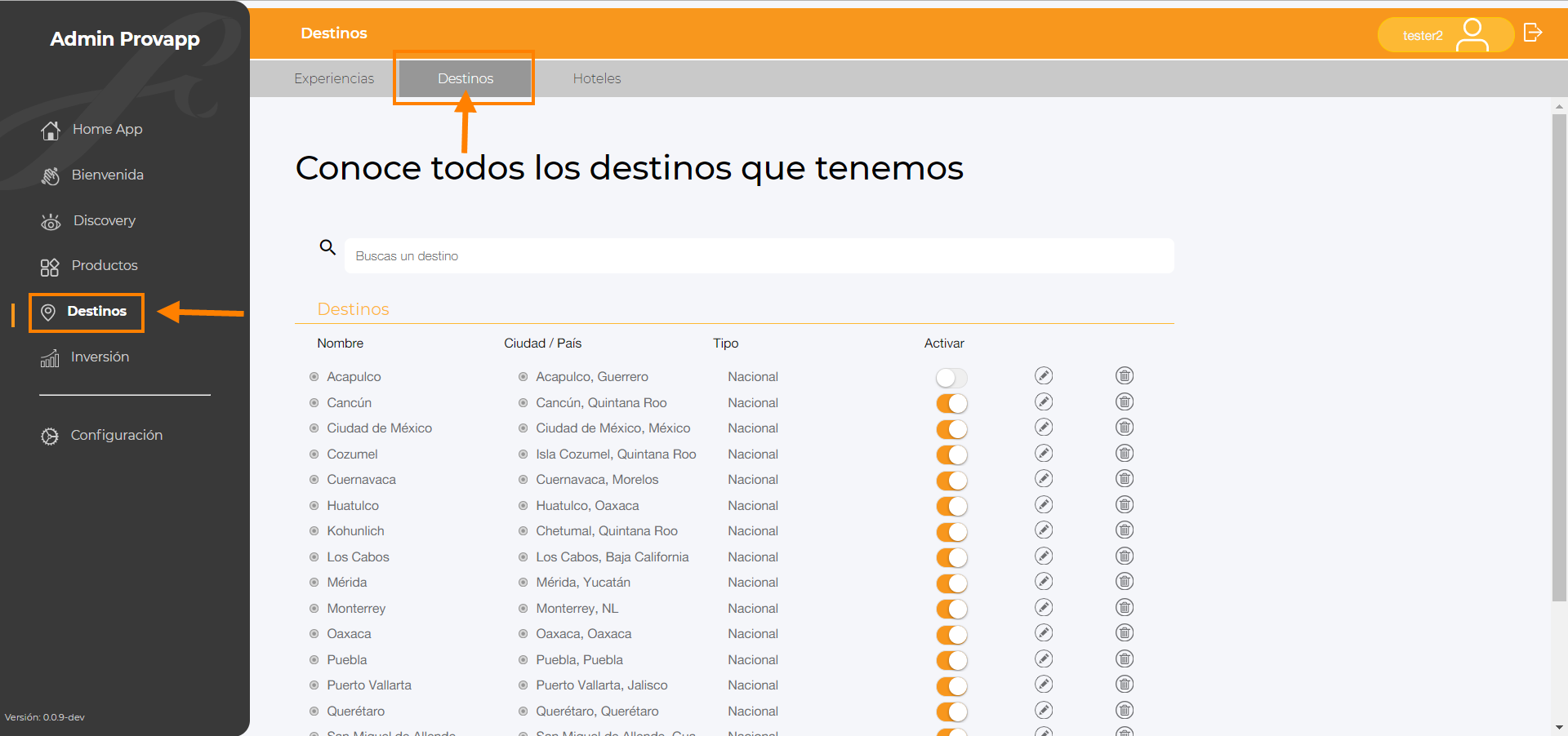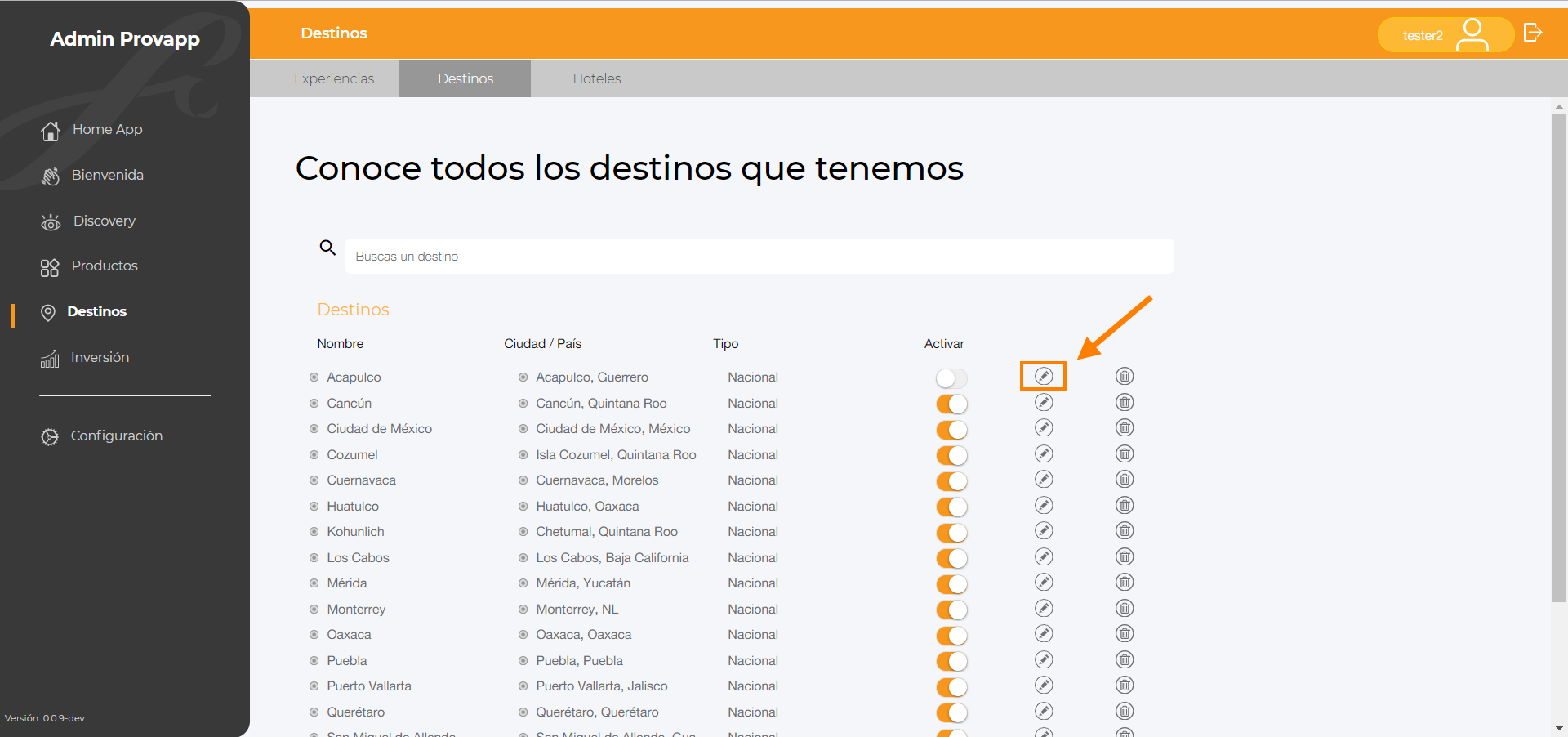 5.- Para editar un destino nacional dar clic en el icono del lápiz, del destino de interés.