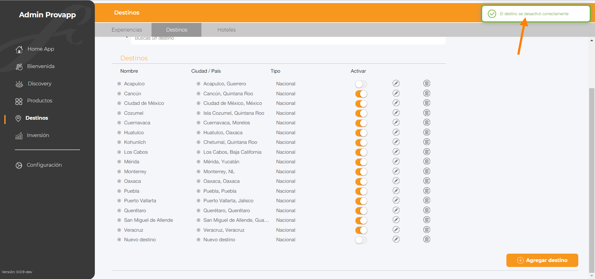 29.- Visualizar el mensaje : El destino se desactivó correctamente.